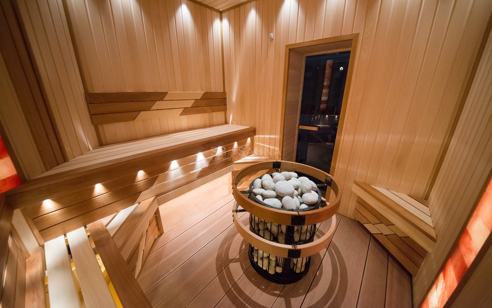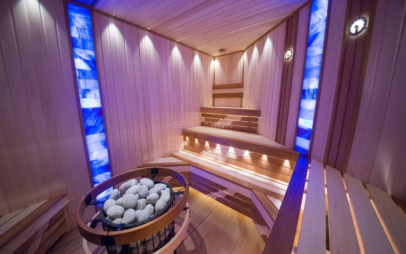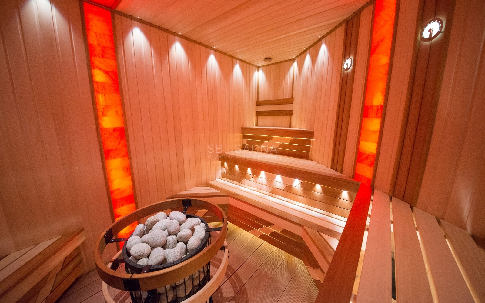Яркие вставки из гималайской соли стали изысканным акцентом этого дизайна финской сауны. Использование гималайской соли несет не только декоративный, но и оздоровительный эффект. Ведь в ней содержится более 80 полезных для человеческого организма микроэлементов.