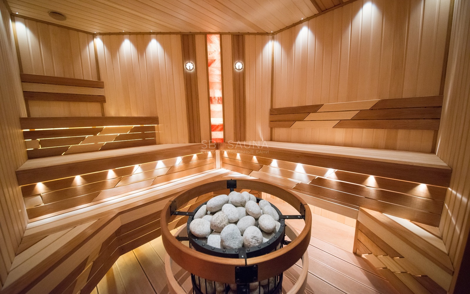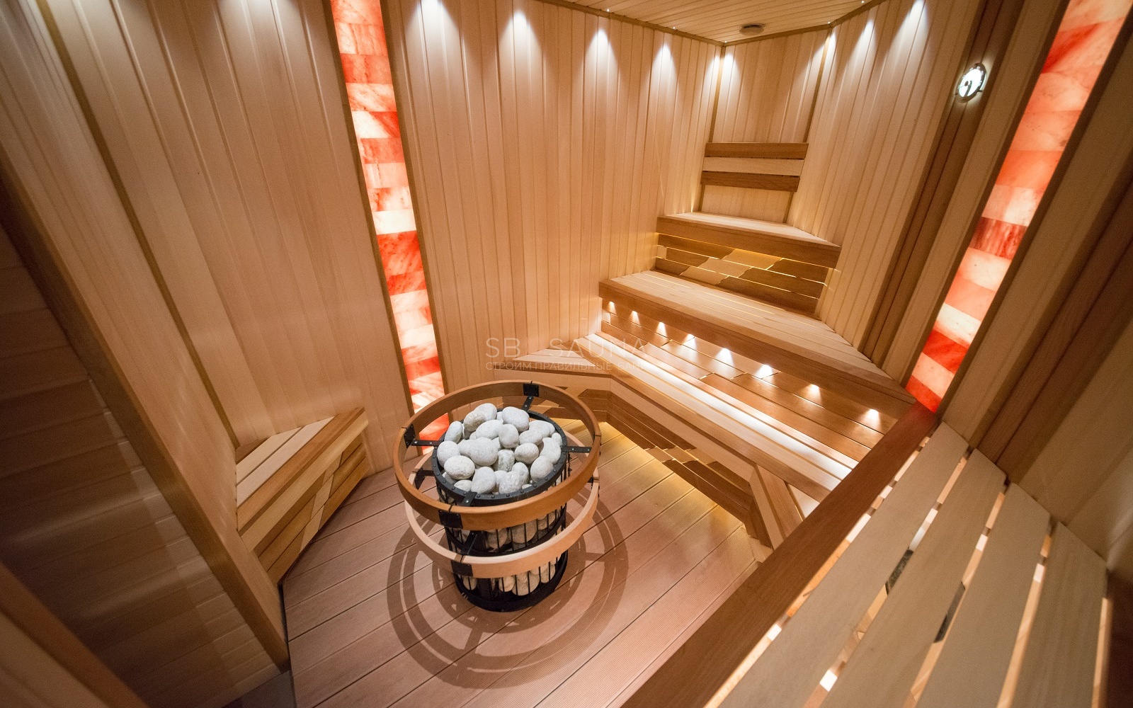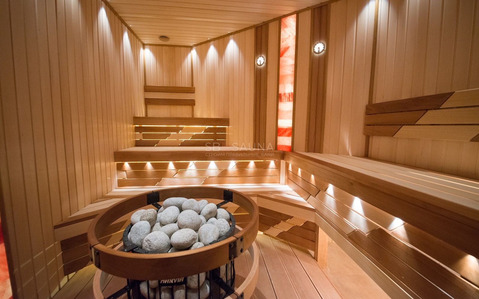 Яркие вставки из гималайской соли стали изысканным акцентом этого дизайна финской сауны. Использование гималайской соли несет не только декоративный, но и оздоровительный эффект. Ведь в ней содержится более 80 полезных для человеческого организма микроэлементов.