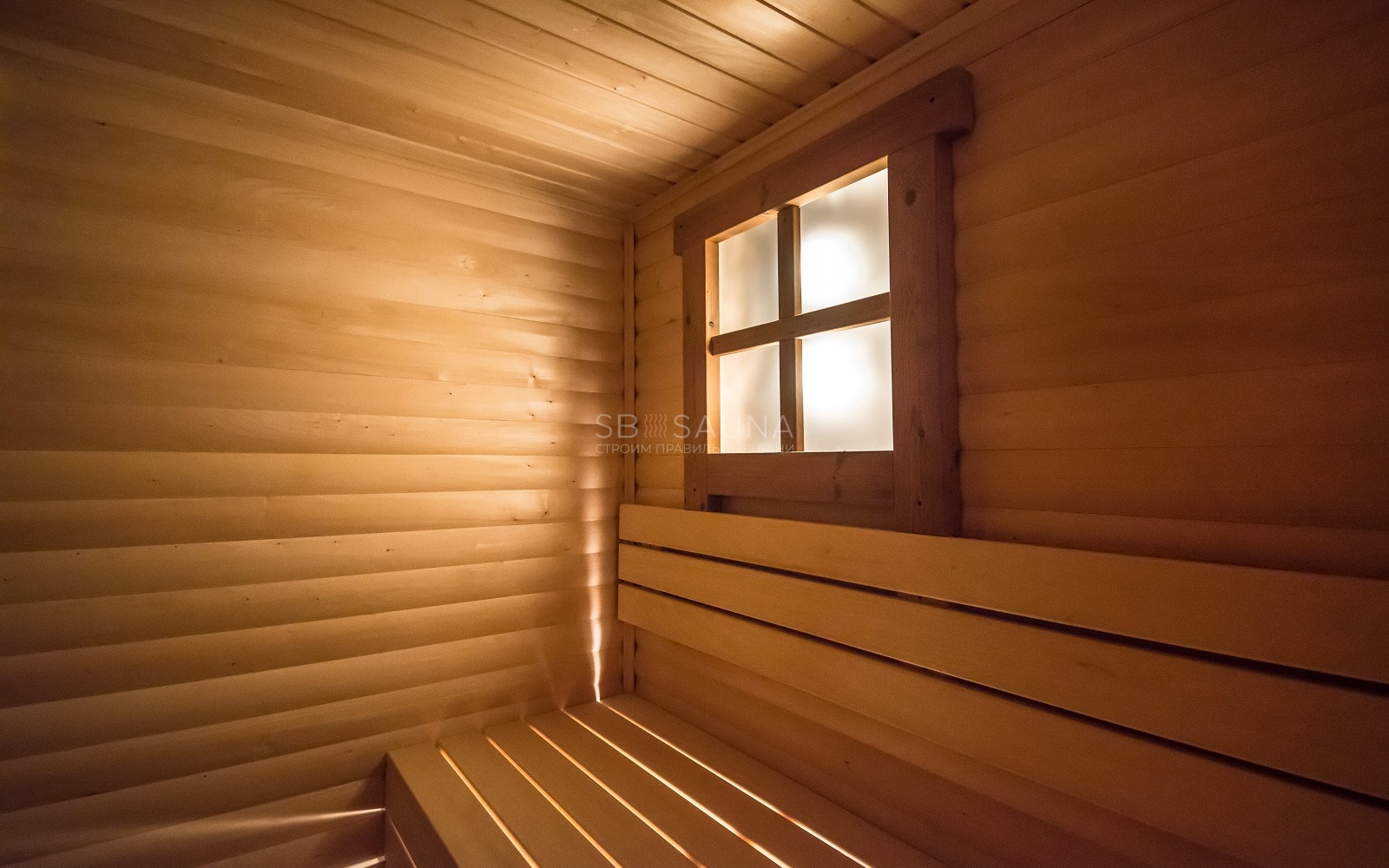 Обратите внимание на "изюминку" этого дизайна - декоративные окошки с подсветкой, что создает эффект нахождения в настоящей русской бане.