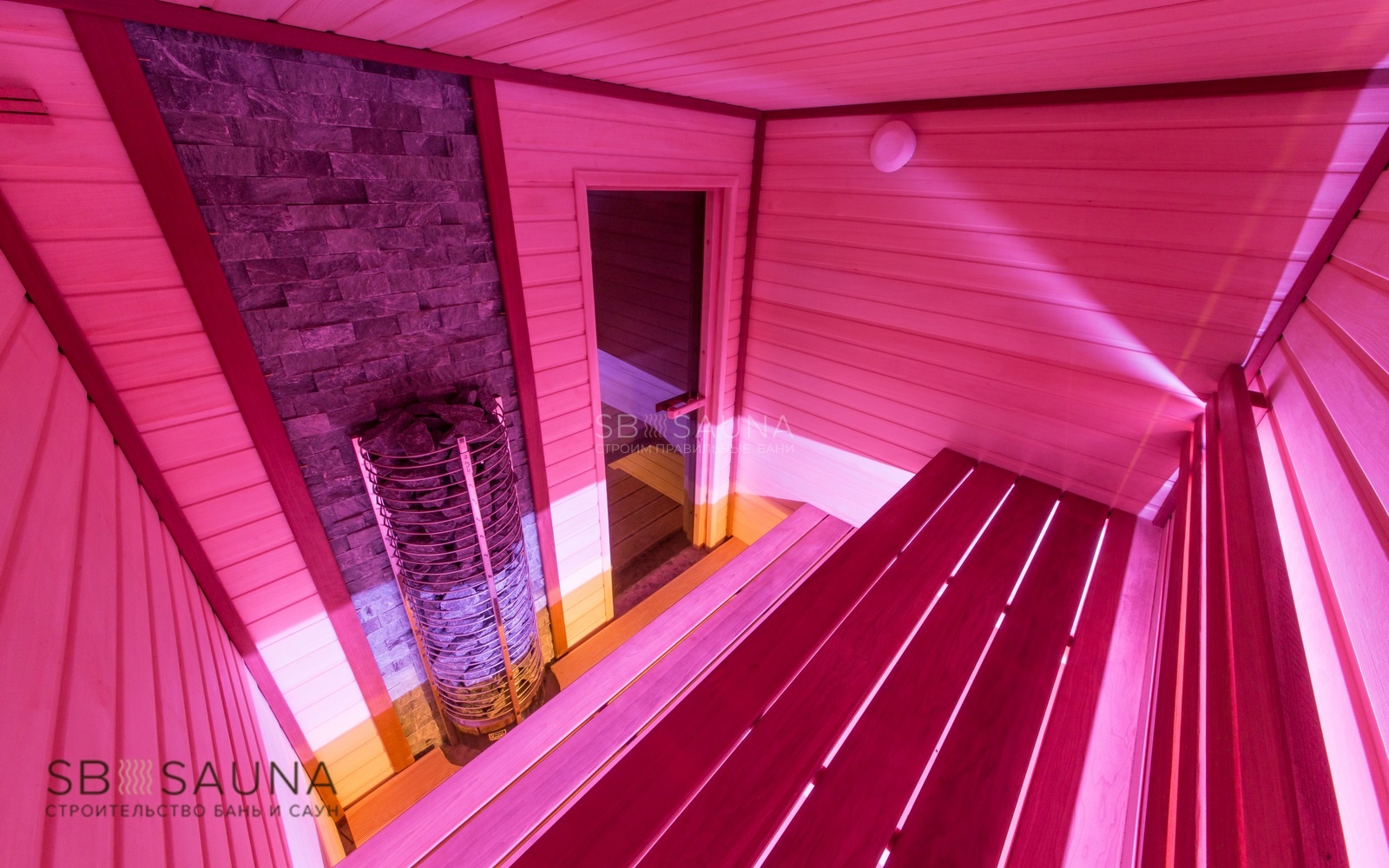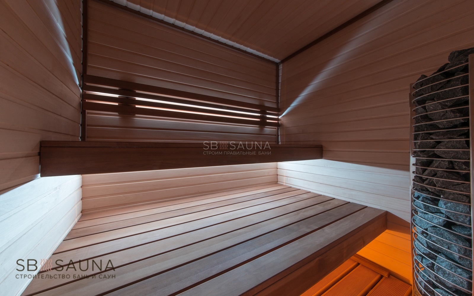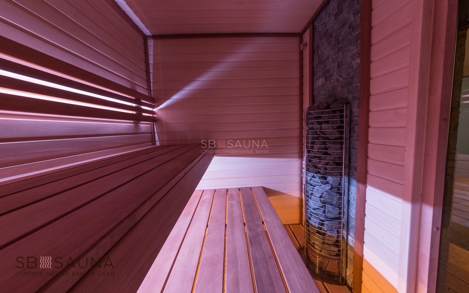 Многоярусные лавки позволяют регулировать температуру пара, которая Вам наиболее комфортна. Для создания более камерной обстановки для освещения мы применили светодиодную подсветку.