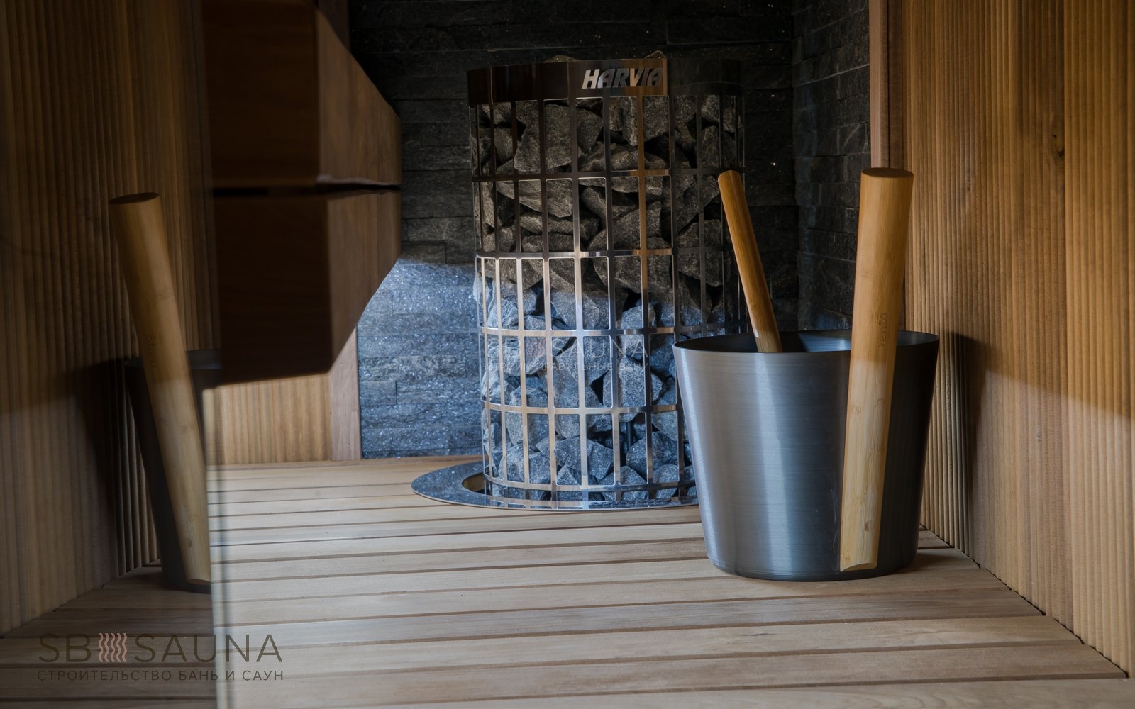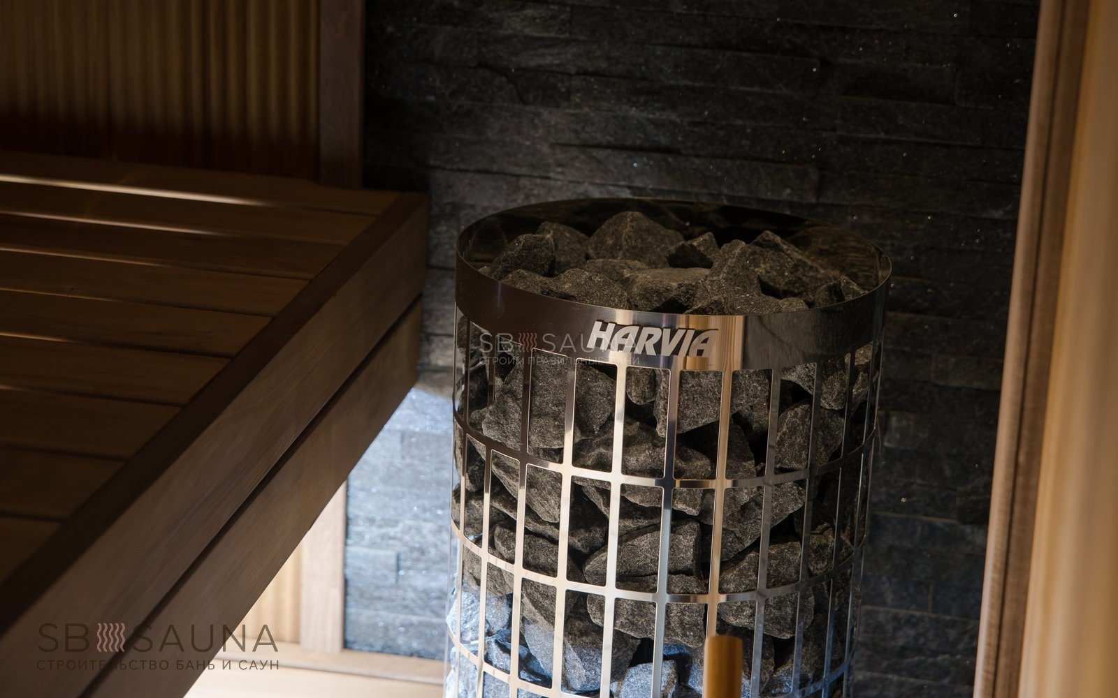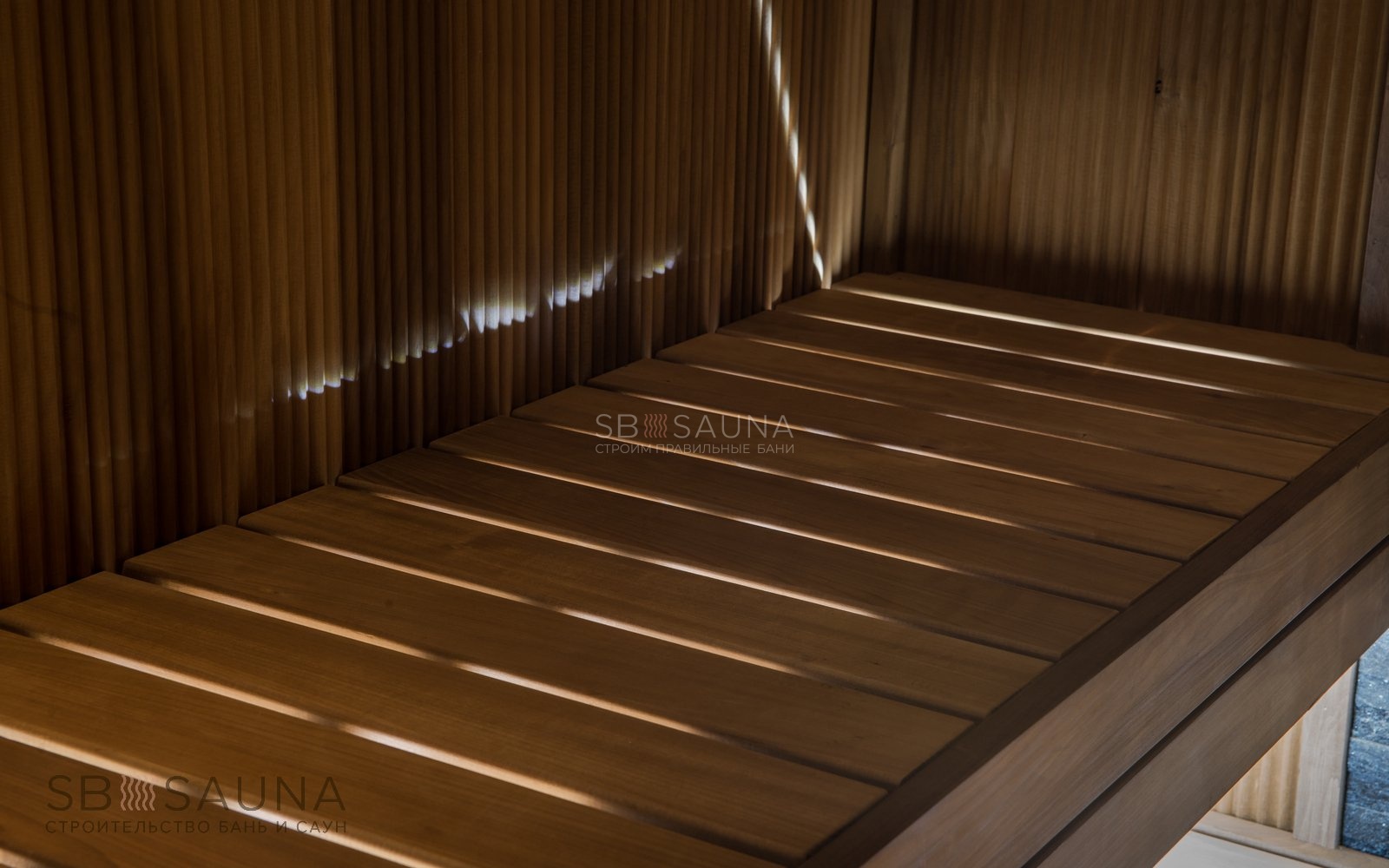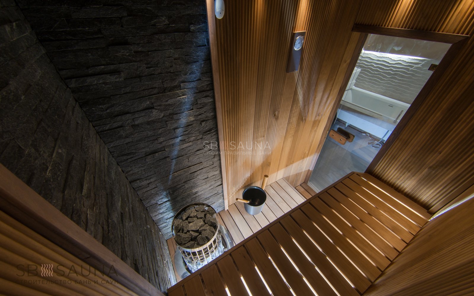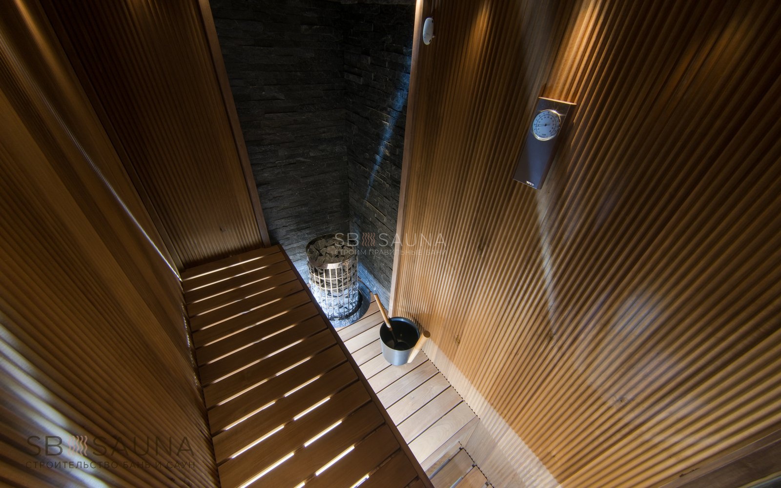 <При создании данной сауны мы старались максимально задействовать свободное пространство, сохранив при этом уют, избегая загроможденности. <В дизайне этой парной использовано необычное решение - вагонка-волна из термоосины. Полок выполнен из термоабаша, дерева, которое греется в сауне до самых комфортных для человеческого тела температур.Печь Harvia Cilindro - удачный выбор для компактных саун, так как ее можно встраивать в полок, что позволяет сэкономить еще больше места. Печной угол из натурального сланца делает сауну в квартире полностью безопасной. А комплект освещения Cariitti VPL10L-E161 создает уют и дополнительно подчеркивает нестандартную волнистую поверхность стен.